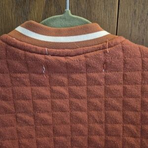 Stylish quilted varsity jacket in teracotta and white. Features a bold 'A' patch on the front with snap closure. Perfect for spring or fall weather.