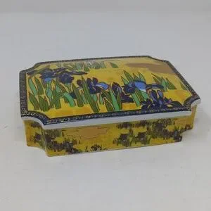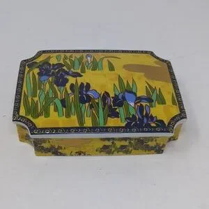 Trinket Box Ceramic Cover Floral Purple Iris Enesco 1979 Jewelry Yellow Gold 6"