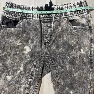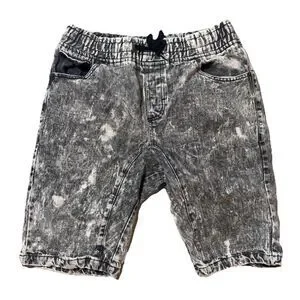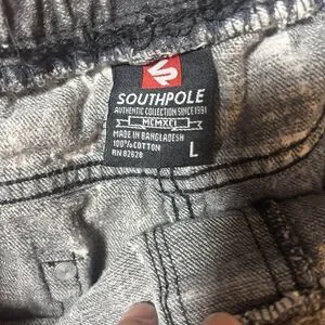 The Southpole Mens Acid Wash Jean Shorts in size Large offer a stylish and edgy look that is perfect for a casual or travel occasion. Made with a cotton denim fabric wash, these Bermuda-style shorts feature a drawstring closure, elastic waist, and slash pockets. With a vintage Y2K streetwear skater punk theme, these gray shorts are a unique addition to any man's wardrobe, featuring a flat front design and easy care features for a low maintenance option. Perfect for the summer and spring seasons, these shorts are sure to make a statement.