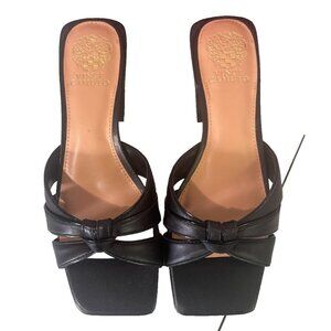 The Vince Camuto Semtra Black Woven Square Toe Sandal is a stylish and comfortable option for casual occasions. This slip-on sandal features a low block heel for added flair and a leather upper and outsole for durability. The black color and solid pattern make it versatile to match a variety of outfits, while the Comfort Slide product line ensures a comfortable fit. Perfect for women who want a blend of fashion and functionality in their footwear.