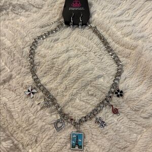 NWT Paparazzi necklace including black, red & white pinwheel, silver bow, heart w/ white rhinestones, whimsical Eiffel Tower stamp, silver teddy bear, red-painted treble clef & dainty black-painted flower w/ pearl center. Adjustable clasp closure. Hypoallergenic, lead & nickel free.