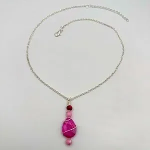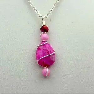 Graceful and eye-catching, this artisan-inspired necklace features a vibrant pink teardrop gemstone wrapped in a flowing silver-tone wire design. Soft blush and berry-toned accent beads add dimension and balance, creating a feminine silhouette with subtle movement.