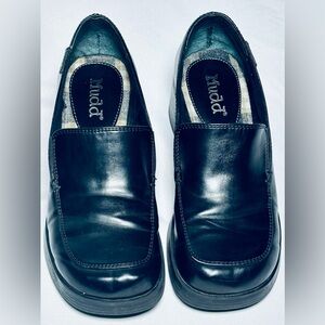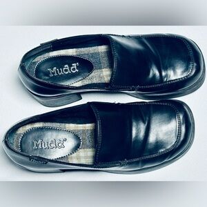 The product is a pair of vintage 90s Y2K Mudd Sharpe black vegan leather chunky platform oxfords for women in size 7. These square toe slip-on heels are perfect for various occasions such as parties, casual outings, formal events, and business meetings. The mid-heel block style offers comfort and a touch of retro flair with its 90s theme. Made with a durable rubber outsole and lined with fabric, these black oxfords are a stylish and versatile choice for any season. Very good condition
