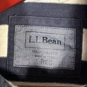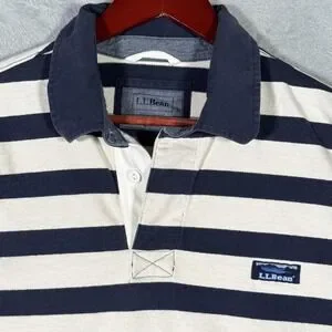 Pre-owned L.L.Bean striped rugby polo shirt with light overall wear from prior use and laundering. Cotton fabric, collar, cuffs, buttons, seams, and chest logo patch are clean and intact with no holes, tears, or stains. Shirt is sold without original tags or packaging and remains in solid wearable condition.