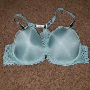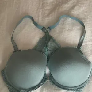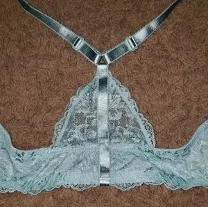 Elegant light green/blue racer back bra with lace detailing. Adjustable straps.