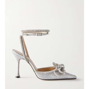 Step into the spotlight with the MACH & MACH Double Bow Glitter Silver Leather Heels — the ultimate statement shoe that fuses glamour, elegance, and playful sophistication. Crafted from high-shine silver leather and dusted with glittering crystals, these iconic heels feature the brand's signature double bow embellishment, sparkling at the pointed toe like a jewel.