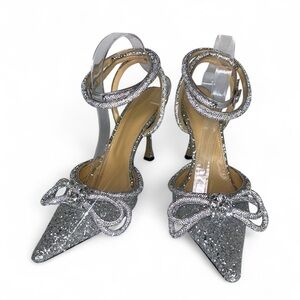 MACH & MACH Double Bow Glitter Silver Leather Heels IT40.5