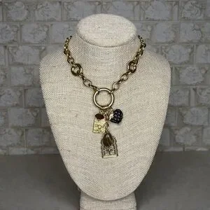 Elegant stainless steel black heart 18k gold plated charm necklace featuring intricate designs. Perfect for adding a touch of sophistication to any outfit. Measures at 16 inches with 2 inch extender, so can go up to 18 inches long.