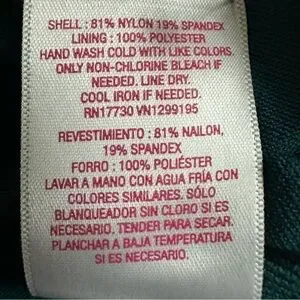 Material: Shell: 81% nylon, 19% spandex; lining: 100% nylon