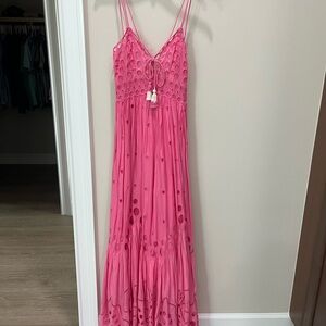 Charming pink maxi dress with eyelet details. Features a flowing design and delicate straps. Perfect for a feminine touch.
