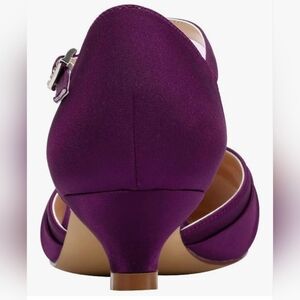 •Feature: Closed toe ankle strap evening party dress pumps featuring pleat satin with rhinestone brooch