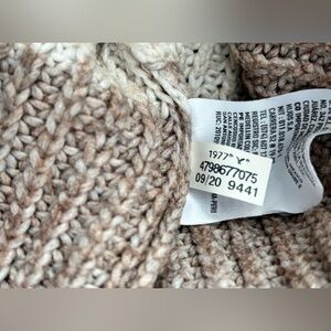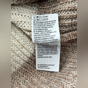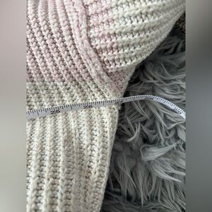 Beautiful sweater by American Eagle in shades of grey, pink, cream, tan, and brown. Viscose/Poly blend knit. High low design is slightly longer in the back with small side slits. Oversized style. Size is an XL, but could fit up to 2X. Pit to pit measures 27”. Shoulder to hem measures 26” in front and 28.5” in the back. Great neutral piece to add to your wardrobe.
