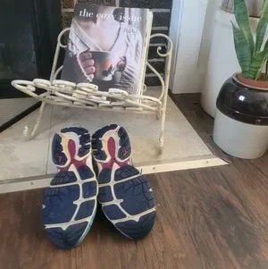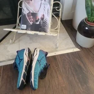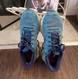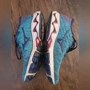 Mizuno running shoes in teal and fuschia. Wear as shown. A little on the inside heel and soles. Knit look. Upper unique teal knit portion in nearly perfect condition.
