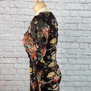 Elegant long sleeve dress with vibrant floral pattern. Features a ruched design and flared hem. Perfect for any occasion.