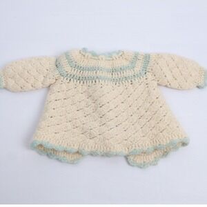 VTG Handmade Crochet Infant Baby Set Sweater Bonnet Booties Cream Blue