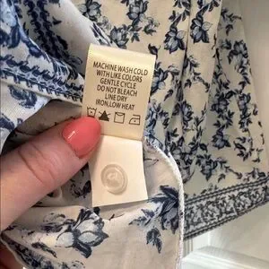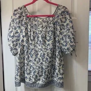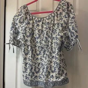 Charming blouse with blue floral design. Features button front and short sleeves. Ideal for versatile styling.