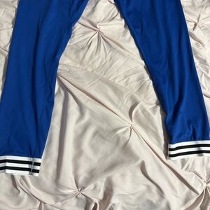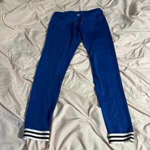Comfortable and stylish blue leggings, featuring trendy striped cuffs. Perfect for everyday wear.