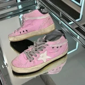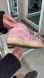 Baby pink canvas, white leather detailing, gray laces, rubber trim, round toes