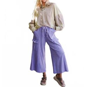 - Description: The Cargo Cascade Wide Leg Pant by Three Bird Nest is a perfect blend of comfort and boho style in a solid blue color. Made from 100% cotton, these pants feature a relaxed wide-leg fit with a high-rise elastic drawstring waistband and convenient side and back cargo pockets. Imported with a pull-on closure, the design includes exposed seams and raw edges for a chic touch. Care: Hand wash cold and lay flat to dry. Dimension specifications are provided to accommodate your perfect fit.