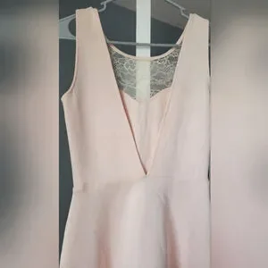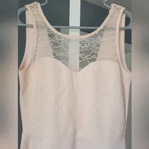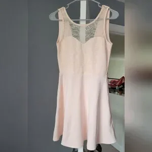 Gorgeous blush pink fit & flare dress with a romantic lace overlay bodice and sheer mesh neckline detail. Flattering skater/A-line skirt gives it a soft, feminine look—perfect for weddings, bridal events, date night, or spring occasions.