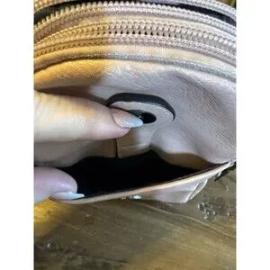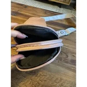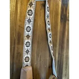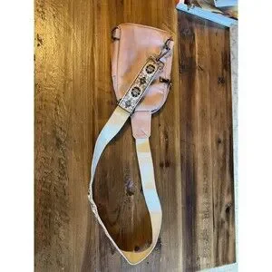 Cute blush pink sling bag with guitar style embroidered, adjustable strap.