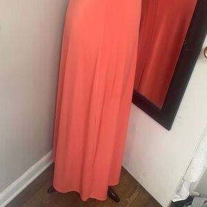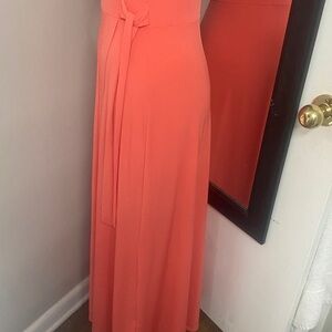 gorgeous coral colored stretchy faux wrap maxi dress with waist tie