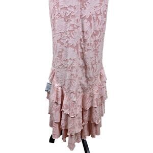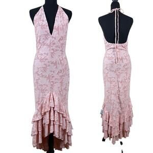 New with tags ASOS DESIGN pink lace halter formal dress in size US 10. Features a flattering halter neckline, fitted mermaid silhouette, and dramatic high-low ruffle hem. The floral lace overlay adds texture and elegance, making it perfect for weddings, formal events, prom, evening parties, or special occasions.