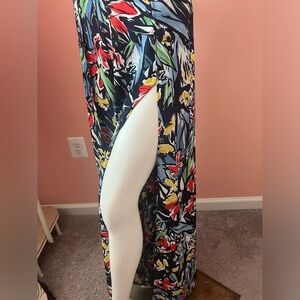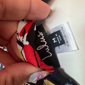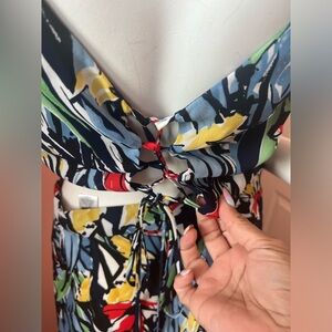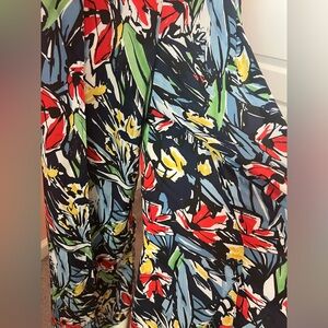 A high, banded waist tops these extra fun woven poly pants in a navy blue, light blue, red, green, yellow, and white abstract print. Overlapping tulip panels and wide legs complete this cool and breezy look!