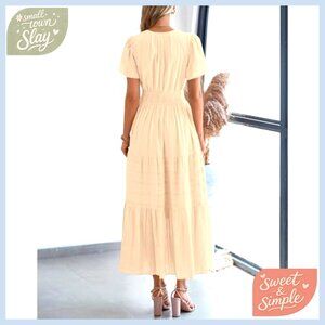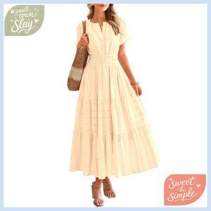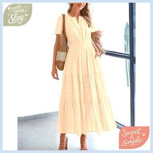 Brand new, never worn, and in flawless condition — this lightweight boho dress features a charming V-neck, short sleeves, and a comfortable elastic waist. The flowing tiered silhouette with functional pockets is perfect for beach days, casual outings, or special occasions.