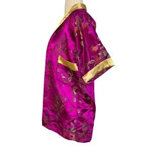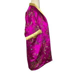 satin robe, Chinese robe, dragon phoenix, kimono robe, Asian inspired, magenta satin, gold trim, lounge wear, boho layering, festival fashion, statement piece, silky robe, lightweight layer, oriental style, vintage inspired, luxe loungewear, unique robe, bold fashion, resort wear, evening layer, boudoir style, cultural design, eye catching, fashion resale, standout robe