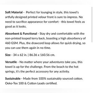 First two photos are model photos, not of actual towel, but near identical design. Same size 30” x 60”