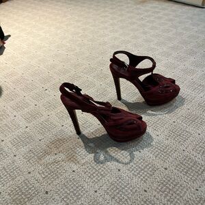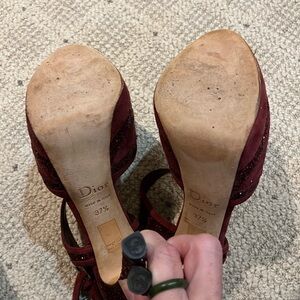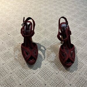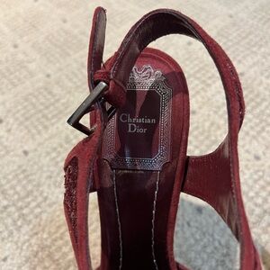 CHRISTIAN DIOR Burgundy Celeste Glitter Suede T Strap Platform Sandals. Covered platform. Worn 2x. Excellent Condition. Made in Italy.