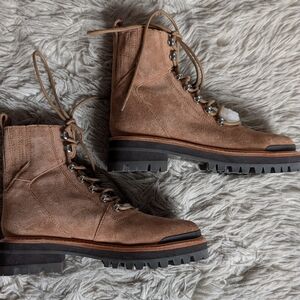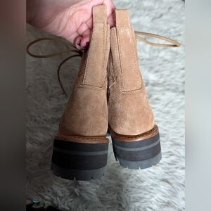 These boots are new, never worn. These are a gorgeous neutral tan suede, perfect for many fall to winter outfits. It has a real white sherpa and lace up design with a lug sole. The only flaw is in the inside lining, as pictured. It's not visible when worn. There was some peeling from where the store had placed price tags. I've priced these very reasonable. Size 6.5, Marc Fisher LTD.
