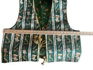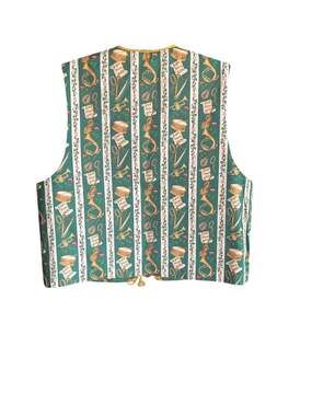 Vintage Reversible Quilted Vest featuring a unique musical instrument novelty print. This eclectic piece offers two distinct looks: one side with a vertically striped pattern of drums, harps, and trumpets, and the other with a scattered instrument print on a leafy green background.