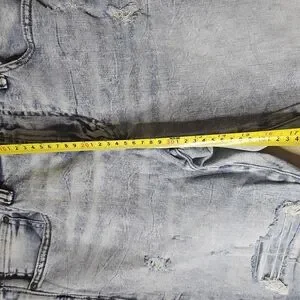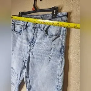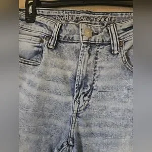 The product is a pair of American Eagle Men's Distressed AirFlex 360 Skinny Jeans in size 34x30 with a light wash blue color. These jeans feature a low rise fit, a slim fit, and a 5-pocket design with a zipper and button closure. Made of a blend of polyester, spandex, and cotton, these jeans offer comfort and stretch for all-day wear. With a distressed look, they are easy to care for and machine washable. Perfect for any season, these jeans showcase the brand's logo and are ideal for a variety of styles including rock, grunge, and 90s-inspired fashion.