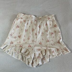 Stylish high waist shorts with floral print. Features a charming ruffle hem. Ideal for casual wear.