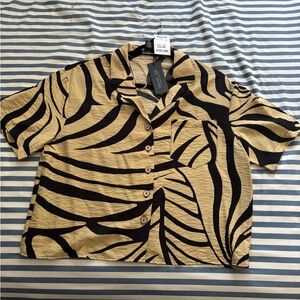 Stylish button-up with bold black and tan pattern. Perfect for casual outings.