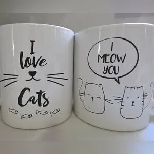Set of two white coffee mugs with black cat lovers graphics - one reads 'I Meow You' and the other reads 'I Love Cats' (can be sold separately)