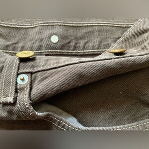 The product is a pair of vintage Levi's 501 men's jeans in size 36x30, featuring a brown color and a button fly. These straight leg jeans are a unique and classic addition to any wardrobe. With the iconic Levi's brand and timeless straight leg style, these jeans offer a comfortable and stylish option for everyday wear. As pictured I believe these to be altered to be able to be used with buckle suspenders. There’s studs on the front and back waist band area. Still a great vintage piece with lots of life left.