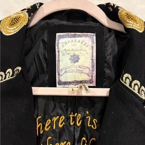 This garment is a Paparazzi by Biz jacket, a brand known for statement pieces featuring detailed embroidery and bohemian-inspired designs Embellishments: The brand is distinguished by intricate wildflower or leaf-pattern embroidery, accented with metallic gold and silver detailing.