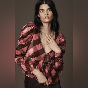 Deep V-neckline accented with a delicate tie-front detail Dramatic long puff sleeves with gathered shoulders.