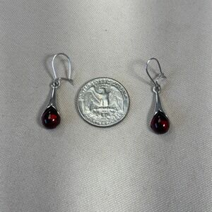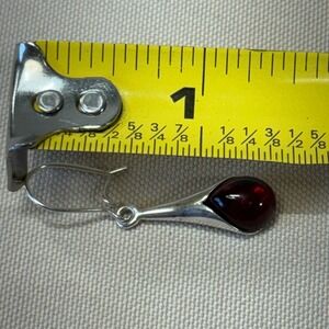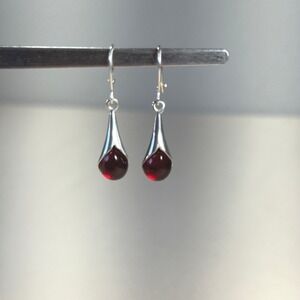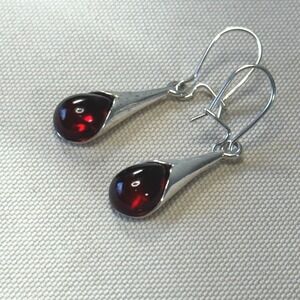 Elegant drop earrings showcase deep red amber cabochons cradled in sleek sterling silver settings. Has normal signs of wear, some surface scratches and tarnish, please review all pics The teardrop-shaped dangles hang from secure lever-back wires, offering a sophisticated look that transitions easily from day to evening. The rich, translucent cherry amber stones catch the light beautifully, complemented by the high-polish finish of the silver metalwork.