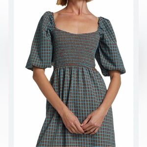 Flaunting a gingham pattern, Wayf's charming midi-dress showcases a smocked bodice with a cut-out back and voluminous elbow-length puff sleeves