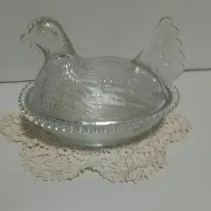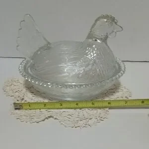Elegant vintage clear glass hen on nest made by Indiana Glass company. Perfect for decor or serving. Intricate detailing on glass. This is in very good vintage condition with no noticeable flaws. Thank you for looking.