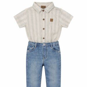 The collared bodysuit features neutral vertical stripes, wooden-style buttons, and bottom snaps for easy diaper changes. Paired with comfy elastic-waist jeans in a light wash, this set is perfect for family photos, birthday parties, church, or everyday cuteness.