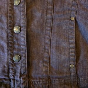 Live a Little denim-style jacket crafted from a comfortable cotton-blend fabric with a hint of stretch. This brown button-front piece features western-inspired yoke detailing and a textured, vertical-weave finish. Designed with a classic collar, long sleeves with button cuffs, and side slip pockets, it offers a versatile layer for casual or smart-casual outfits. The bronze-tone hardware is embossed with a sunburst motif, adding a unique touch to the timeless silhouette.