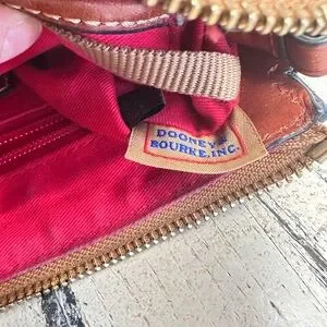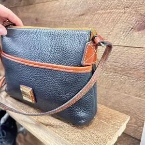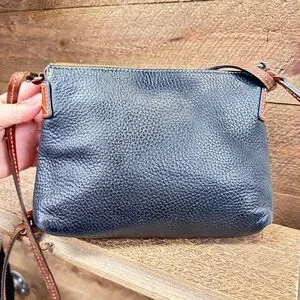 Beautiful Dooney & Bourke pebbled leather crossbody in a rich navy blue with classic British tan leather trim and contrast stitching.