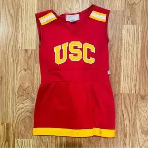 Little kid’s USC cheerleader dress with yellow accents. Perfect for game day. Pullover style, stretchy material.