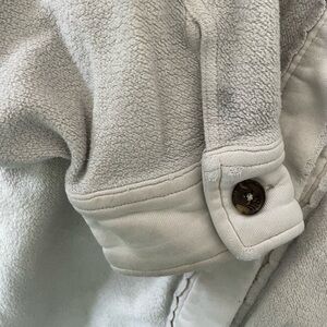 Stylish bone colored button-up jacket. Features front pockets and elbow patches. Minor stains shown in pics.