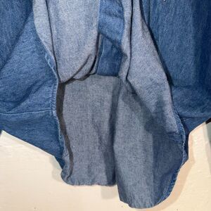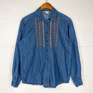 Keywords and Style Keywords: vintage Koret denim shirt, 90s embroidered blouse, cottagecore denim top, southwestern inspired shirt, artsy teacher style, western denim button down, 90s minimalist fashion, embroidered jean shirt, retro casual top, Poppy House 502